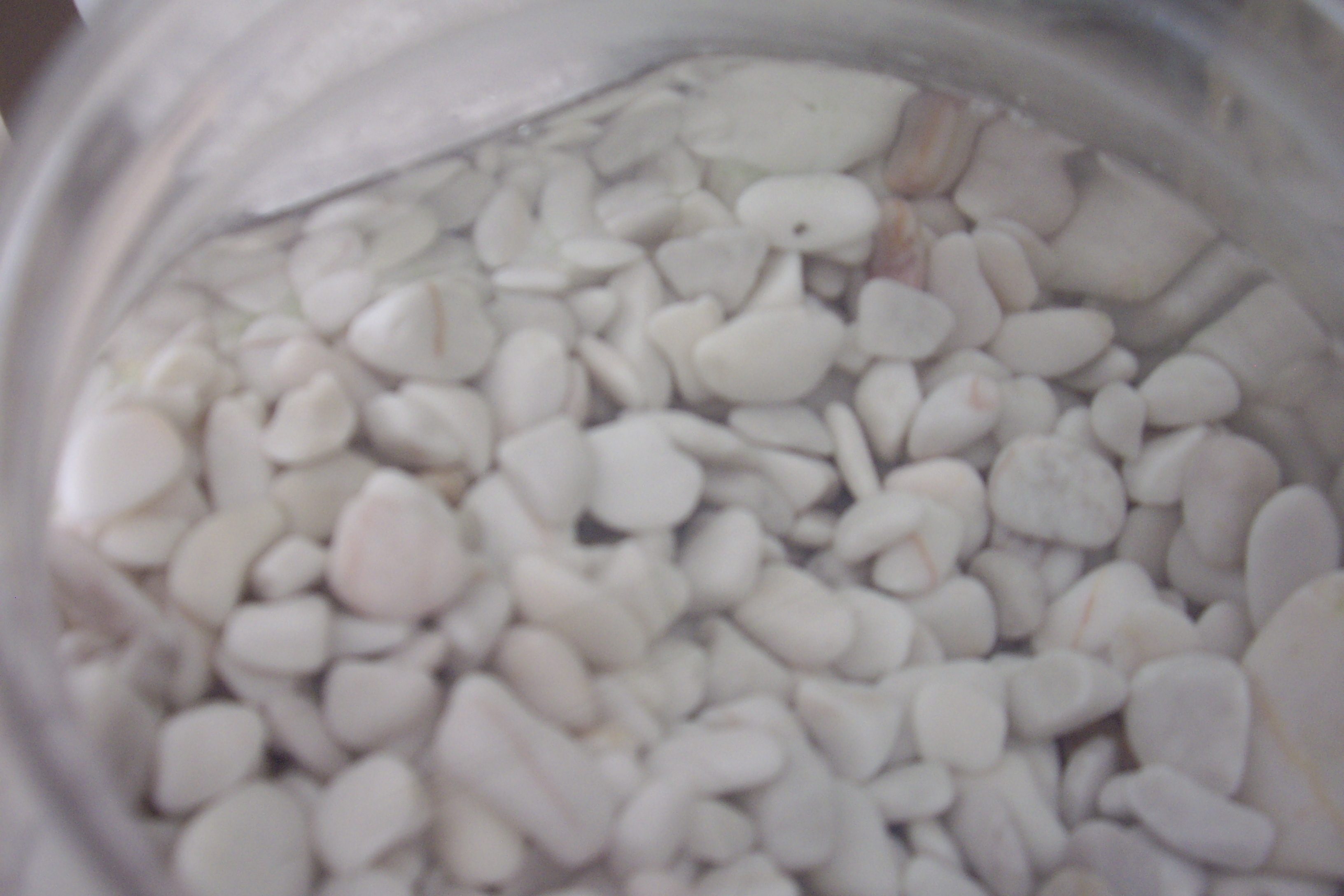 Piedra decorativa, Mármol pulido (boleado) en color blanco, en presentación de bolsas plásticas de 20 kilos. Tamaño chico (1”) y grande (2 ½”). Normalmente puesta en jardines con piedras decorativas